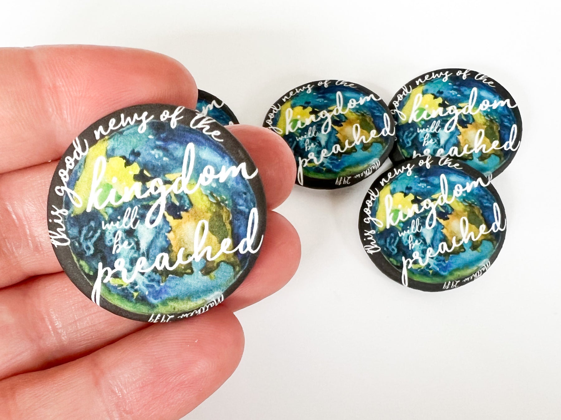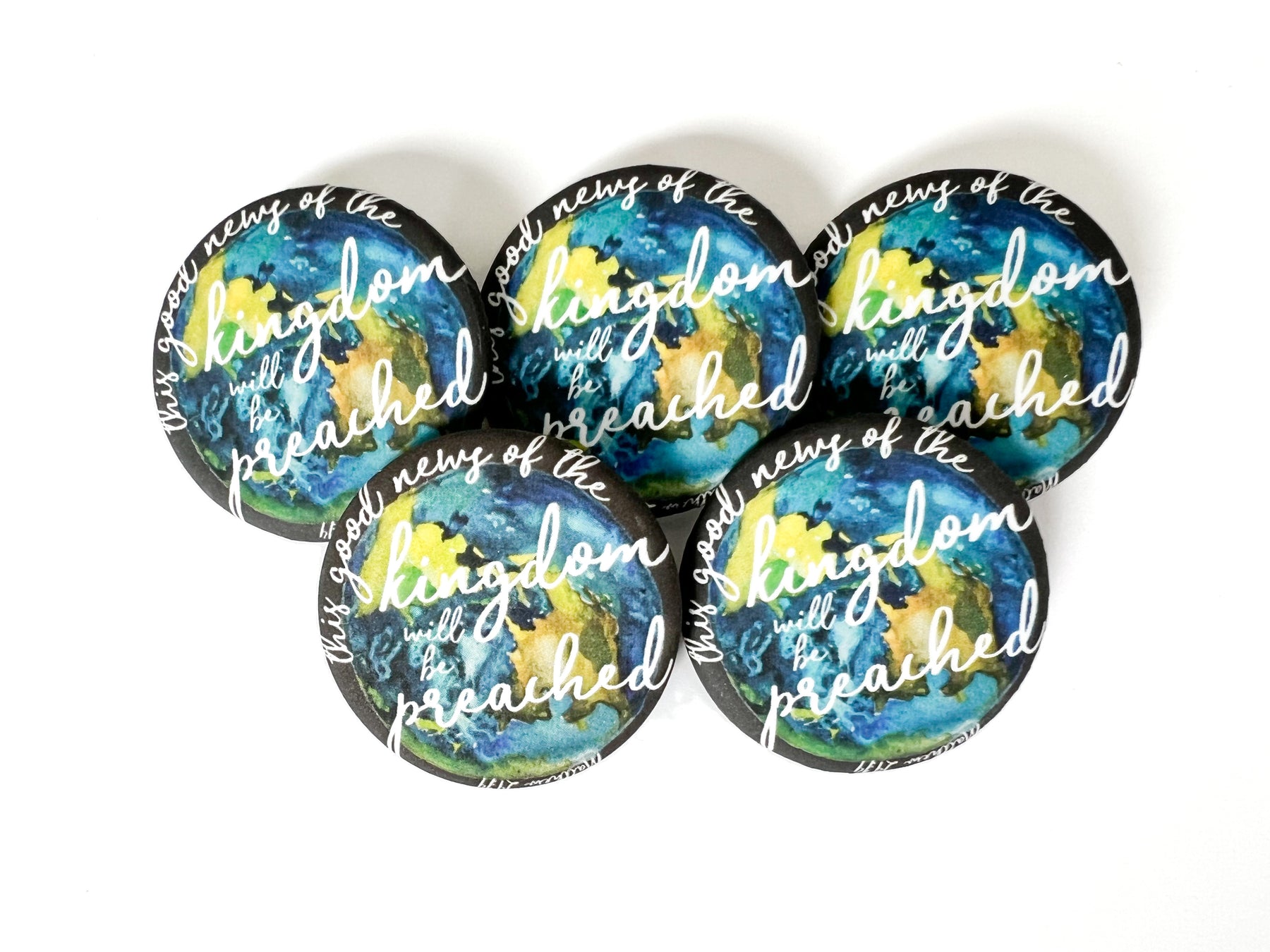 These are light-weight and durable pins, and come in packs of up to 100. They measure 1.25 inches across, have a matte finish, and are backed with a bar pin closure to keep it securely in place at all times.