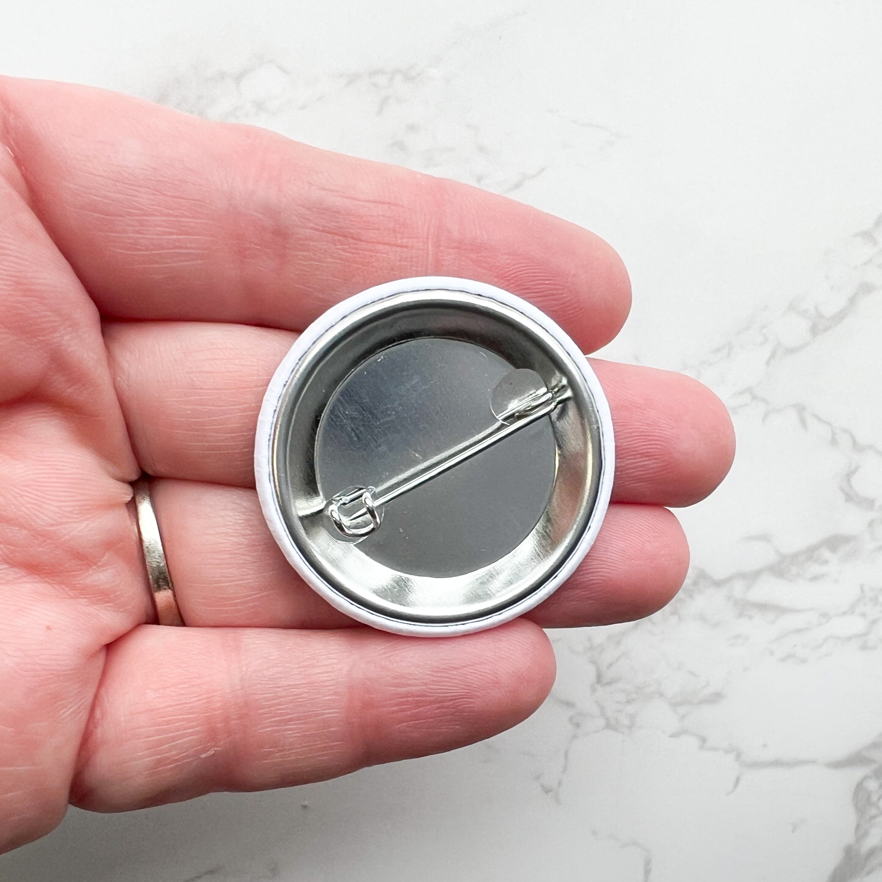 These are light-weight and durable pins, and come in packs of up to 100. They measure 1.25 inches across, have a matte finish, and are backed with a bar pin closure to keep it securely in place at all times.