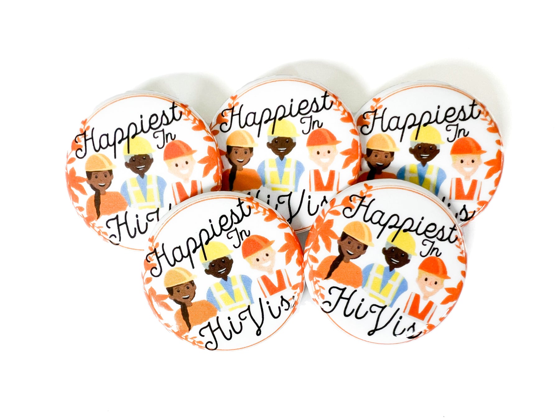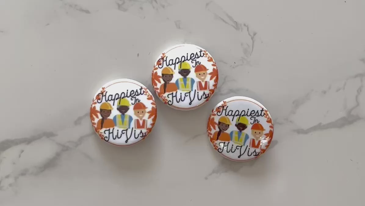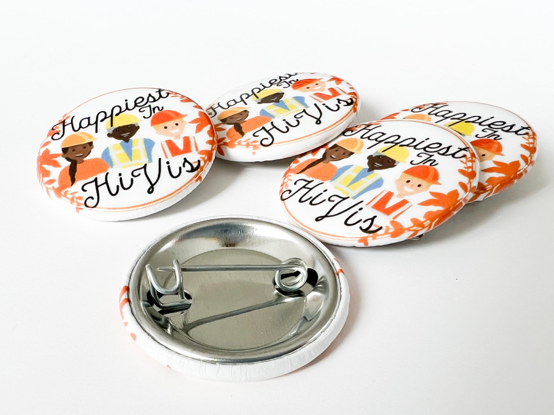 These light-weight and durable pins come in packs of up to 100. They measure 1.25 inches across, have a glossy finish, and are backed with a bar pin closure to keep it securely in place at all times. Grab a couple and get decked out to go drywall, or hand them out to some hard-working volunteers.