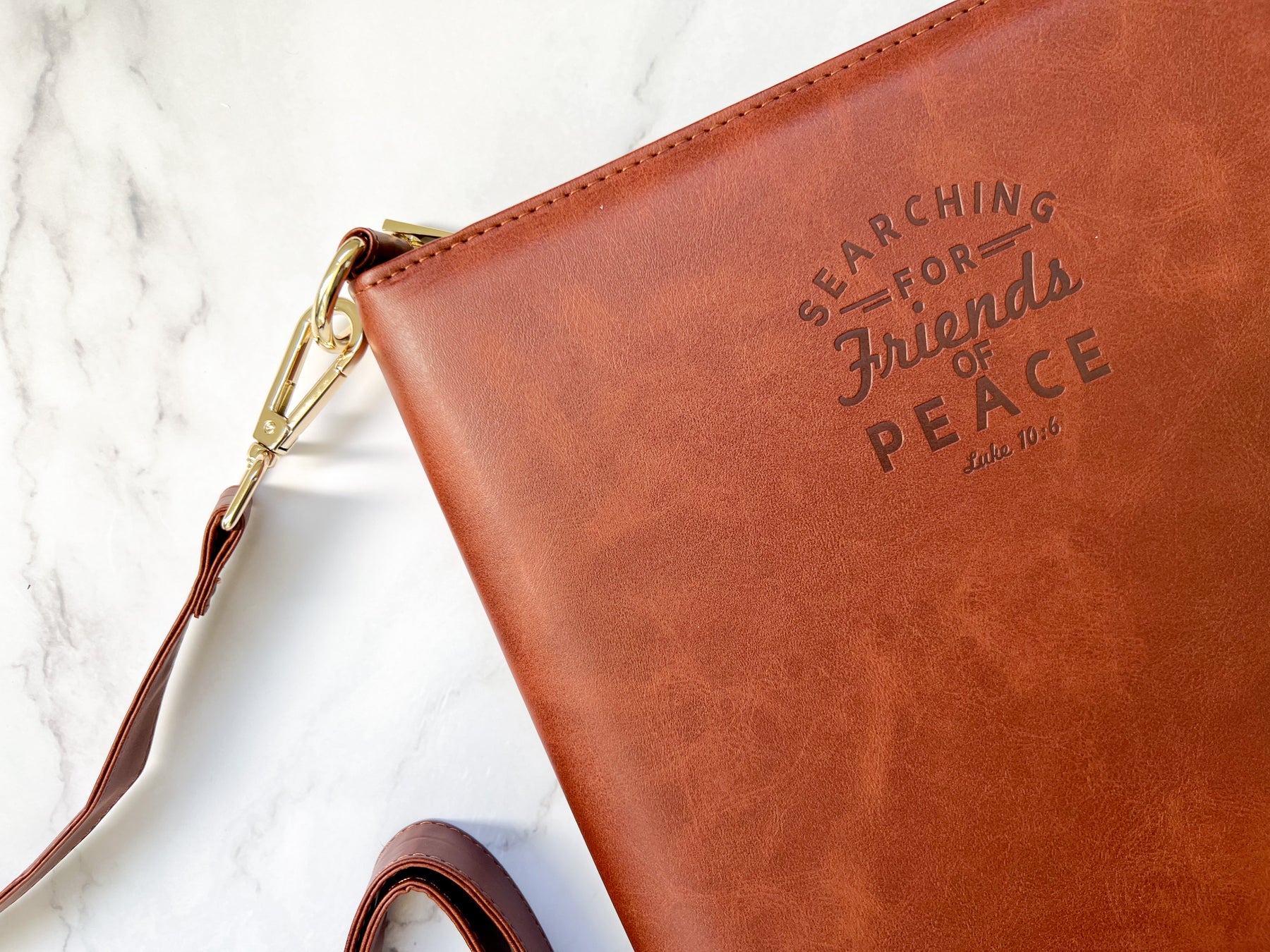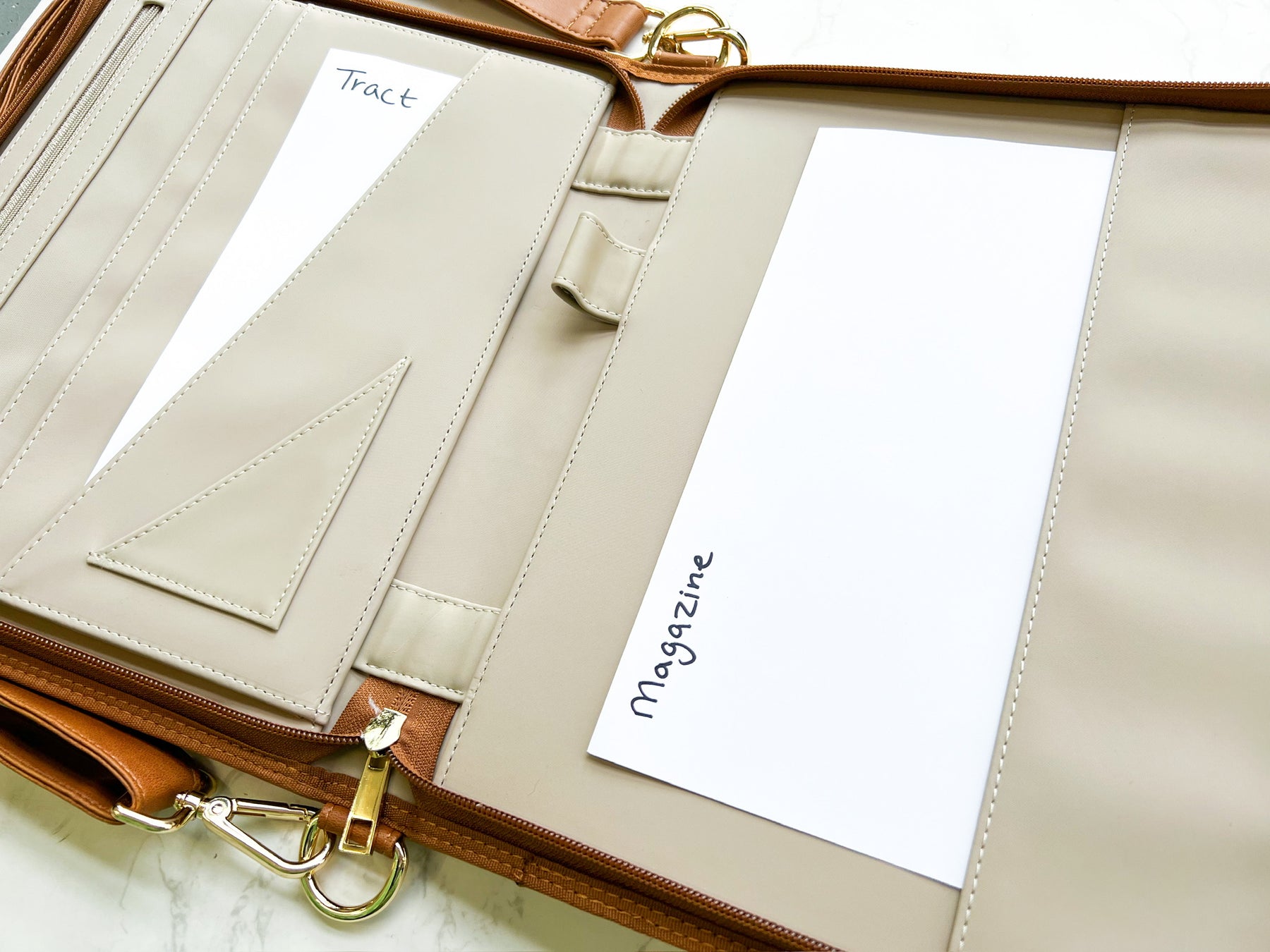 This warm distressed faux leather organizer was designed just for our literature! Perfect for tracts, magazines, contact cards, and hopefully everything else you need. (perhaps an iPad… depending on your iPad, case etc. This is not intended to be a iPad case or offer your iPad protection from harm. However there are two openings that potentially could fit a iPad)