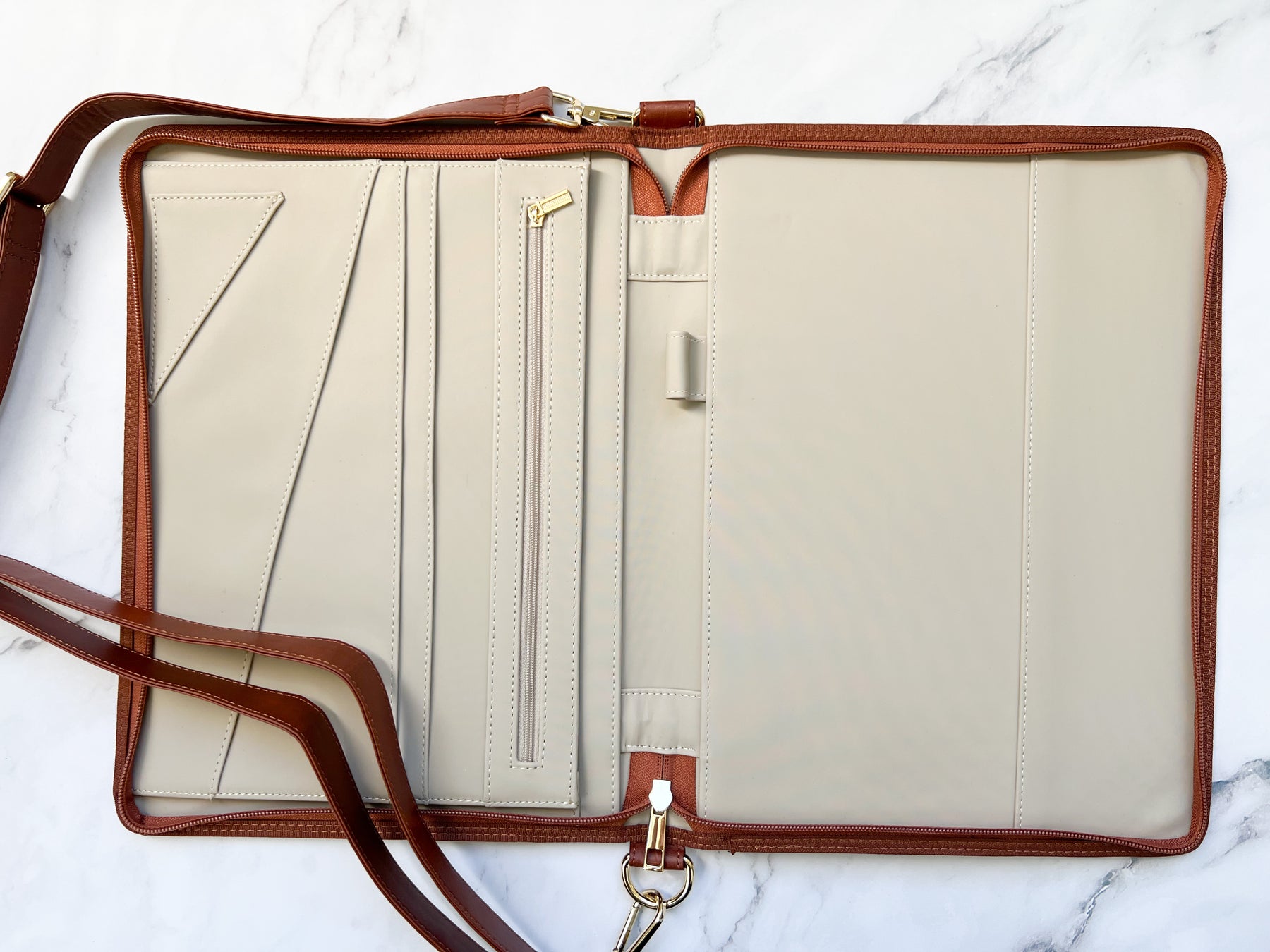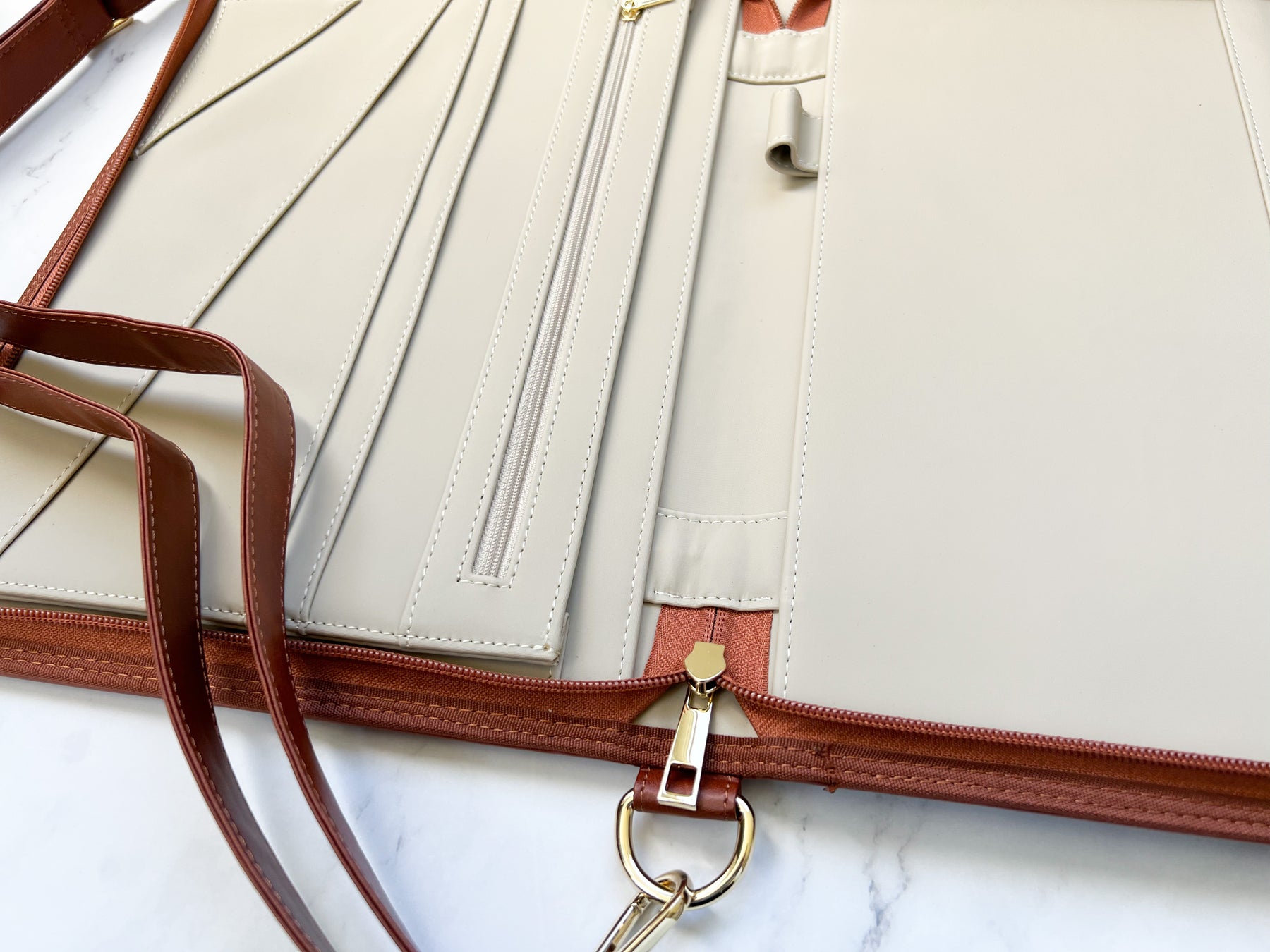 Both inside and out are wipeable to keep it clean and professional looking. It also has a zipper closure to keep your tools dry and beautiful.