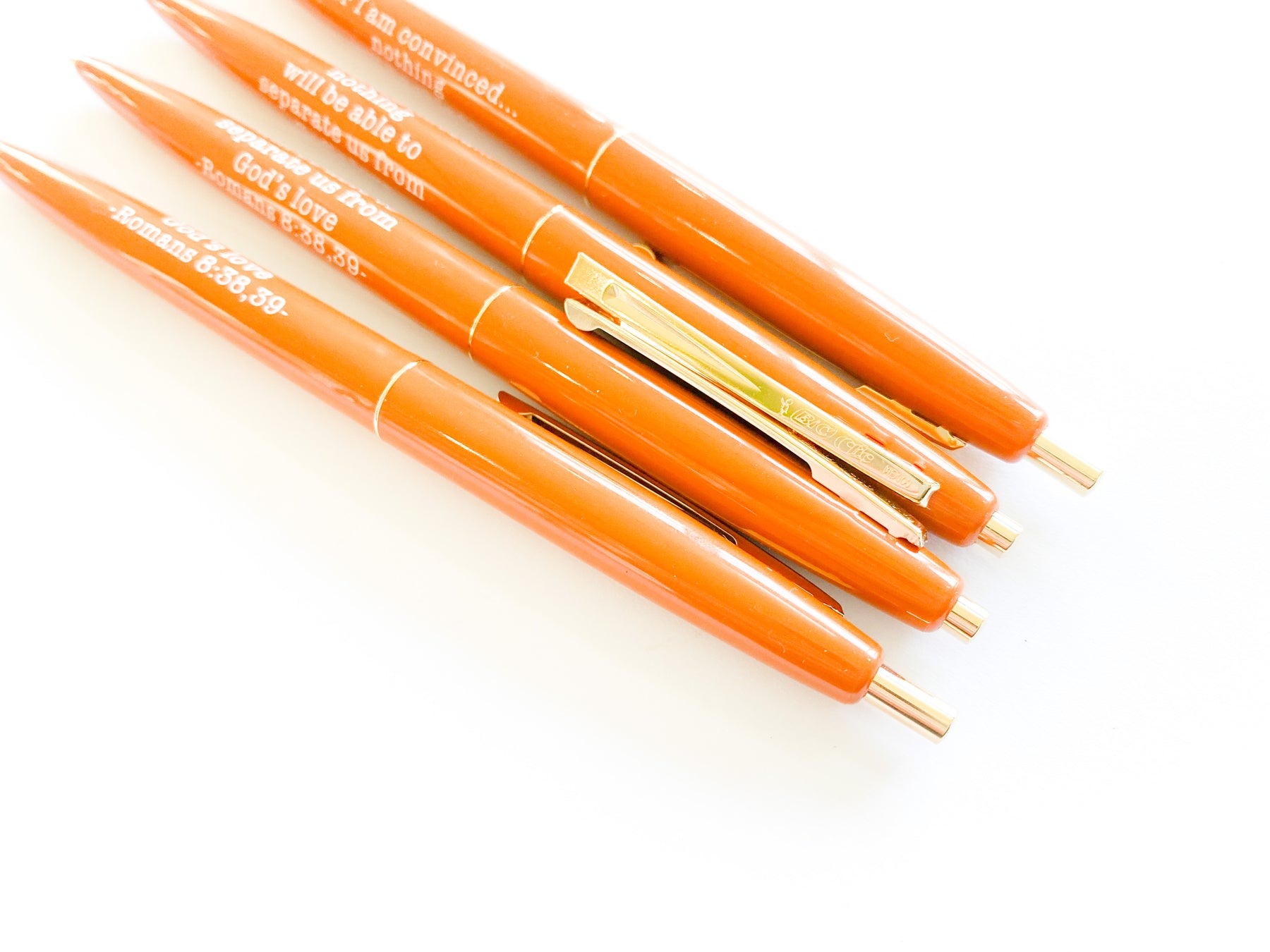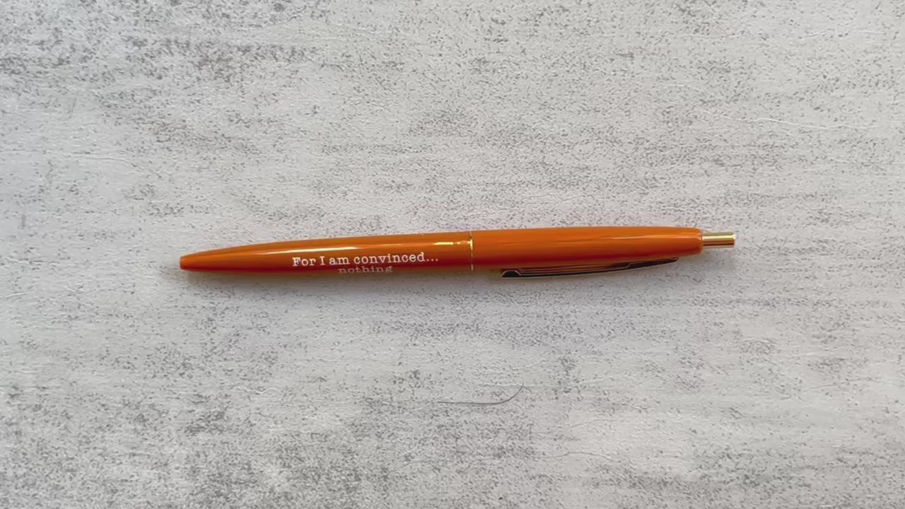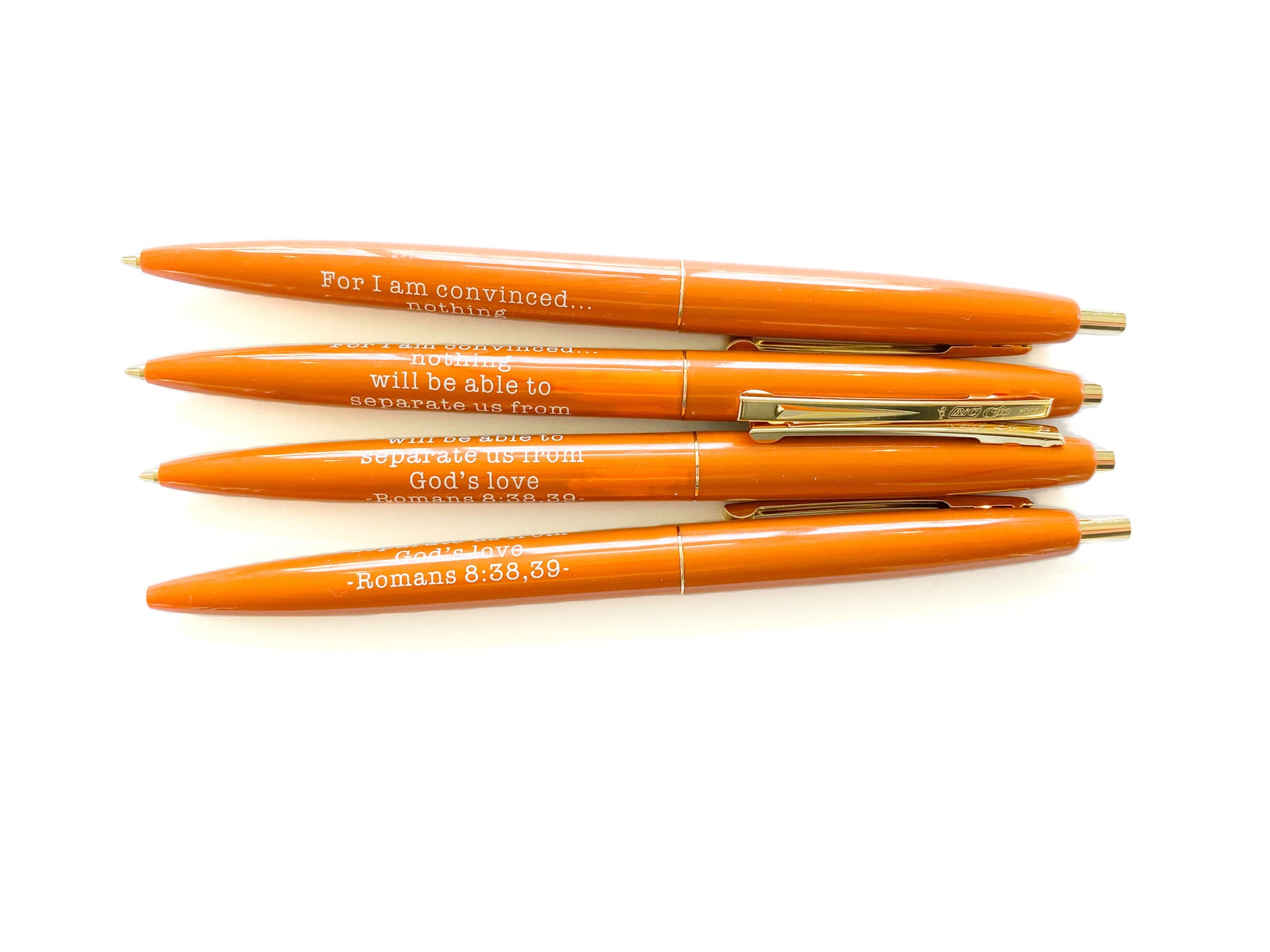 Our “For I Am Convinced” ballpoint pens are manufactured by Bic.
