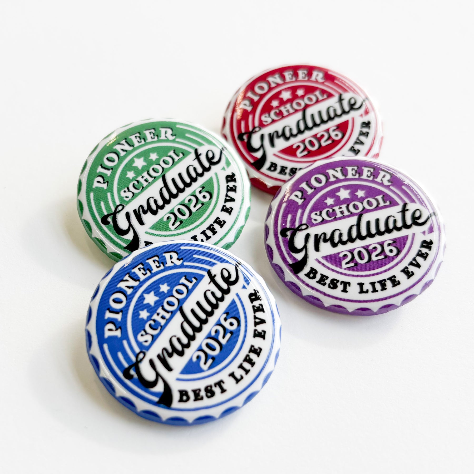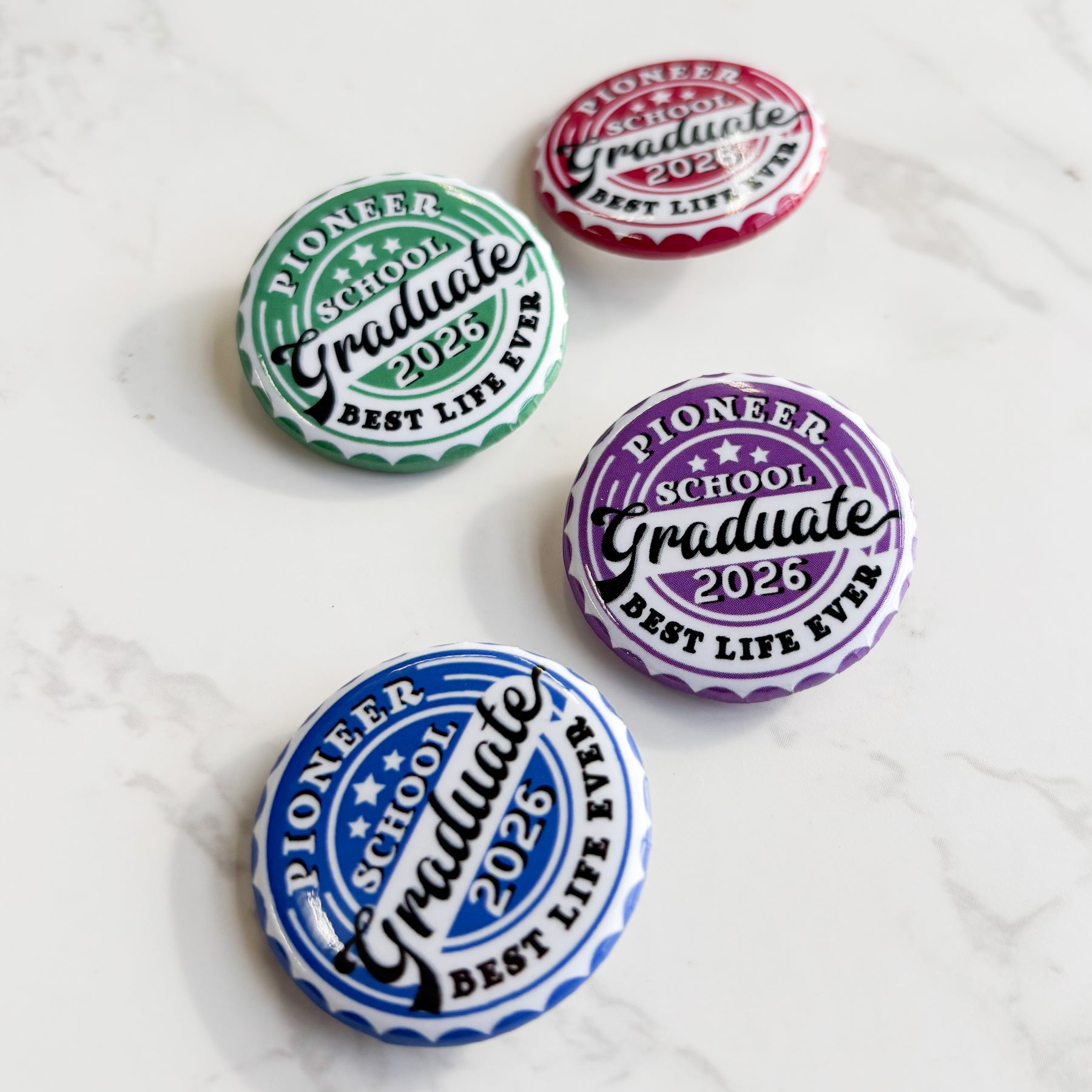 These light-weight and durable pins are made in-house, and come in packs of up to 100. They measure 1.25 inches across, have a gloss finish, and are backed with a bar pin closure to keep it securely in place at all times.