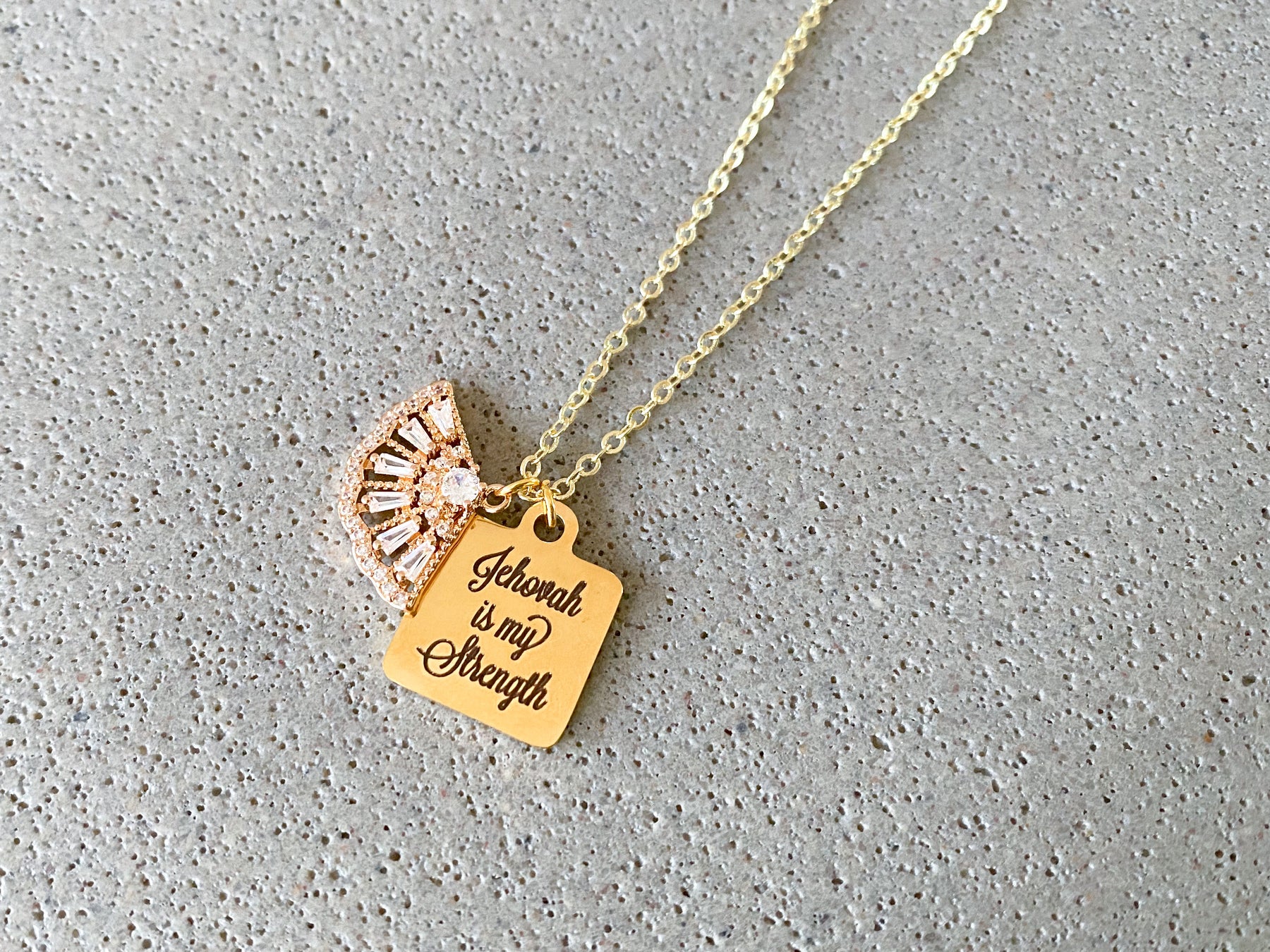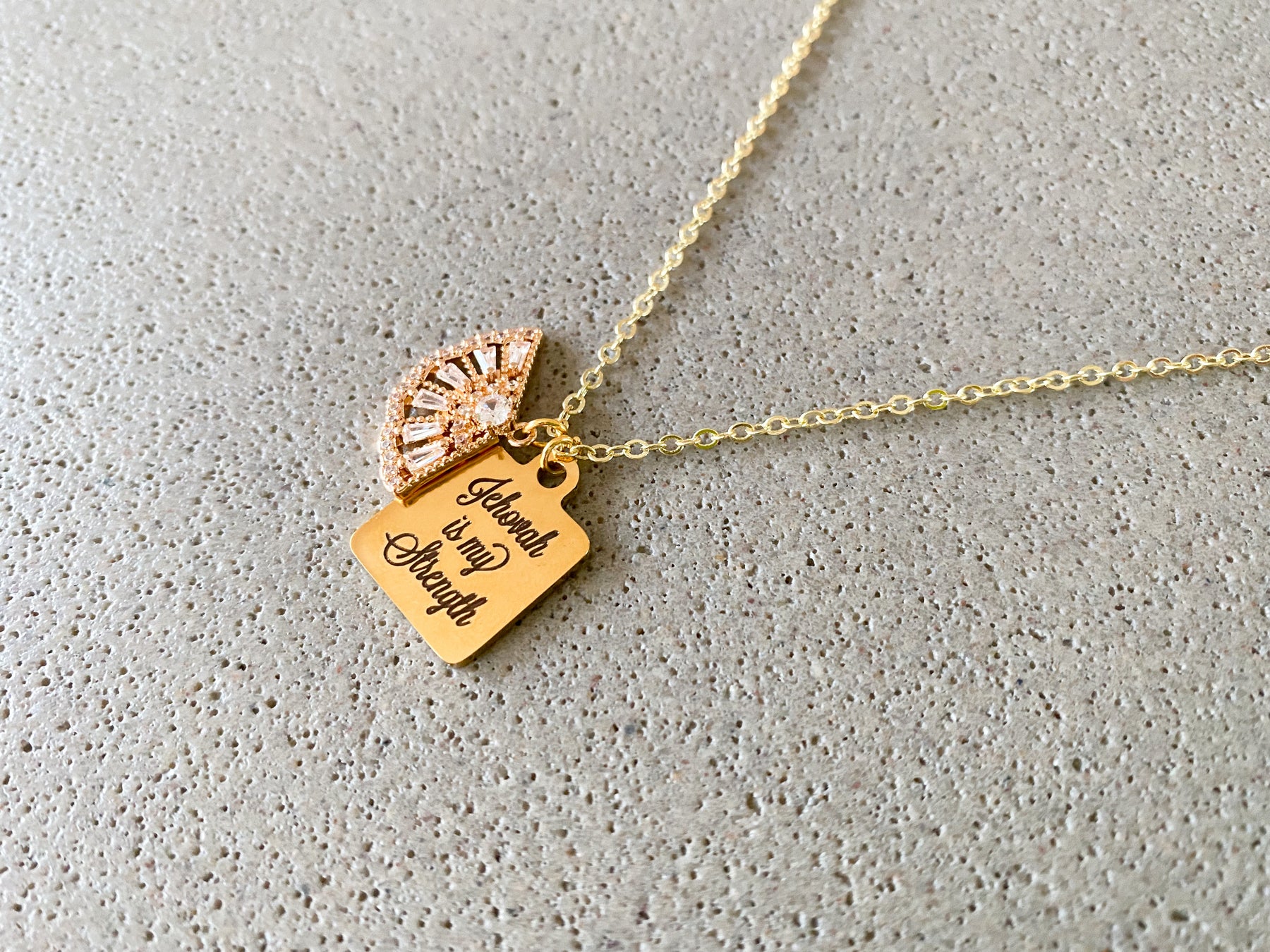 Jehovah is my Strength Rhinestone Fan Gold Necklace